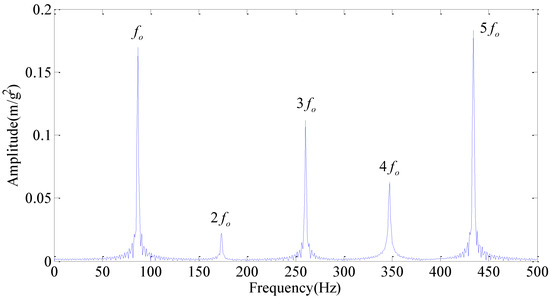 Subsequently, we apply our improved DMD method on the measured signal with chosen parameters . The non-fault signal modes are filtered out and the useful signals with characteristic frequencies are retained by examining each bin (total sixty-four pins) of the seventh level. Then, the reconstruction matrix can be obtained by Formula (23). Figure 9 shows the spectrum of our improved DMD method. Obviously, not only are the fault frequency and its harmonics (, , , ) easy to be identified, but there is also little interference frequency close to them. That is to say, we are more confident to determine that the outer race of the testing rolling bearing has failed, which is highly consistent with the actual situation.