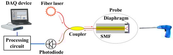 where h and R are the diaphragm thickness and radius, respectively, and E, μ, and ρ are the elastic modulus, Poisson’s ratio, and density of the diaphragm material, respectively. A photodiode collects the interfered light and converts it into the electrical current. After the signal is amplified and filtered by a processing circuit, the voltage signal Vout is then acquired by a data acquisition (DAQ) device, which is given by []: