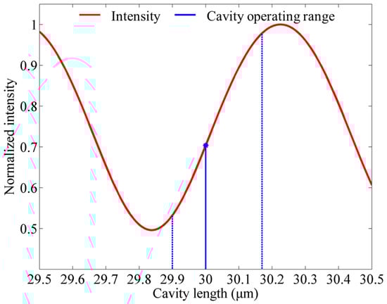 Figure 2 gives a simulation result of the relationship between cavity length and the interference intensity according to Equation (3), where R1 = 0.04, R2 = 0.9, and λ = 1550 nm. The figure shows that the detected light intensity varies in the period of λ/2. To obtain the linear range of the intensity variation, the initial cavity length should be set in the middle of a λ/4 period to provide an adequate operating range for the FP cavity. Therefore, a 30-μm-deep cavity is designed in this work.
