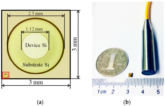 Photographs of (a) SOI diaphragm structure and the sensor chip; (b) a packaged extrinsic Fabry–Perot interferometric (EFPI) sensor probe.