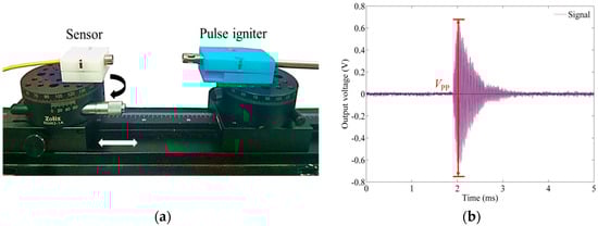 (a) Photograph of the experimental setup; (b) The detected ultrasonic signal from the pulse igniter.