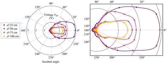 Figure 6 shows the Vpp values of the sensing system for different ultrasound incident angles varying from 0 to 360° with a step of 15°. The angle-dependent measurements are taken in four different distances d between the discharge source and the sensor. The measured voltages at 25, 50, 75, and 100 cm demonstrate a similar variation trend, and each fitting curve shows an approximately symmetric distribution along the horizontal axis. The received signal within the ±45° incident range at 50 cm has a relatively flat response varying by 3.58 dB and 5.90 dB within ±60°, which is close to the results of an epoxy-encapsulated EFPI sensor []. However, utilizing rubber or polymer as the encapsulation material can create a wider angular response because of their smaller acoustic impedance than the air–steel interface. There are repeated results showing that the weakest signal is mostly detected at 135° but not the backward direction of 180°. However, there is no reflective medium in front of the sensor to make an echo. One possible explanation is that the polymer adhesive used at the end of the stainless steel tube to seal the gap has better permeability to ultrasound than the stainless steel. Therefore, a part of the backward incident ultrasound waves transmits through the adhesive into the sensor chip and makes the diaphragm vibrate, while the ultrasound wave for other incident angles, such as 135°, meets the tube surface firstly and leads to a huge attenuation due to the mismatch of acoustic impedance. In addition, the slope on the tube end may also plays a role in decreasing acoustic pressure. Nonetheless, the sensor is able to recognize weak signals of discharges from all incident angles within 1 m, especially in the range of ±60°. The results also exhibit an optimized sensor array: only three sensors, which are embedded in the electrical equipment, are required to realize on-site monitoring and accurate localization.