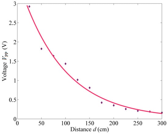 Figure 7 shows the Vpp values of the detected signals based on different distances d varying from 25 cm to 300 cm with a step of 25 cm. The measured data indicate an exponential decay as the distance increases. Then, a fitting curve is constructed utilizing the MATLAB fitting toolbox, and the result is: