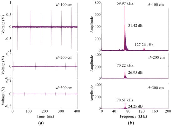 The ultrasonic signals of discharges at 100, 200, and 300 cm are shown in Figure 8a, respectively. As the discharge source is 300 cm to the sensor, there is a distinct signal that is as great as 8 times the background noise, which indicates the high sensitivity of the ultrasonic sensor. The amplitude-frequency responses are computed by the Fast Fourier Transform (FFT) function in MATLAB and plotted in Figure 8b. All of the detected ultrasound signals show a spike in magnitude around the signal’s frequency components of 70 kHz. The other smaller peak amplitude can be observed around 127 kHz when the discharge source is closer. Moreover, the signal-to-noise ratio (SNR) has been marked on each figure. The SNR of 31.42 dB at d = 100 cm is slightly higher than that of the reported fiber-optic ultrasonic sensor [] and shows a possibility for the detection of weak sound signals at a further distance.