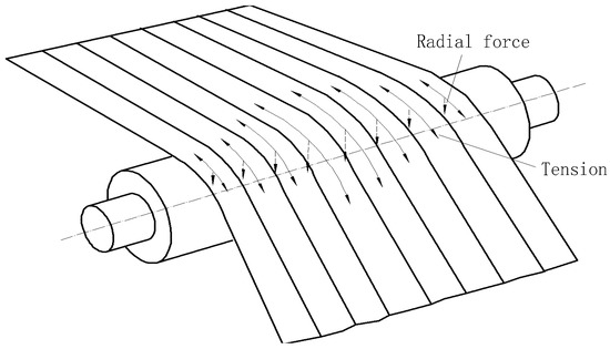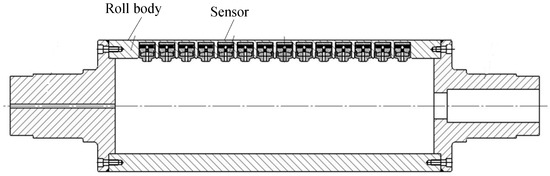 As shown in Figure 6, on-line measurements of the non-uniform longitudinal extension of the strip are impossible, but the strip shape can be described by the distribution of the transverse tensile stress in the strip. During the rolling process, the strip is tight on the shapemeter roll. The longitudinal tensile stress and residual stress of the strip are therefore converted into the pressure of the shapemeter roll outer surface. The on-line shape of the strip can then be determined by measuring this pressure [1,2]. The entire roller-embedded shapemeter plays a critical role in measuring the on-line pressure of the strip.