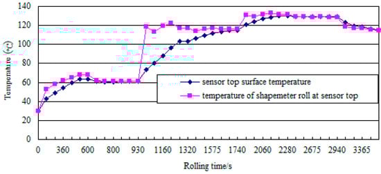 The temperature of the contact surfaces at the top of the sensor (see Figure 8) is determined via the method described in [9]. As the figure shows, the contact-surface temperature increases initially and then decreases with increasing number of rolling passes. The temperature of the shapemeter roll at the top of the sensor is greater than the temperature of the sensor top surface. This results in a temperature difference between the contact surfaces at the top of the sensor. The maximum difference (~60 °C) occurs in the third rolling pass. Owing to the temperature difference, the thermal-deformation difference between the contact surfaces will increase, whereas the sensor pre-pressure and the reliability of the sensor will decrease.