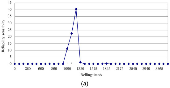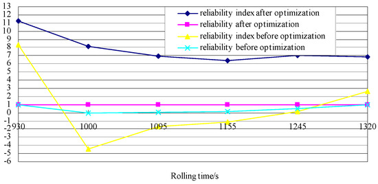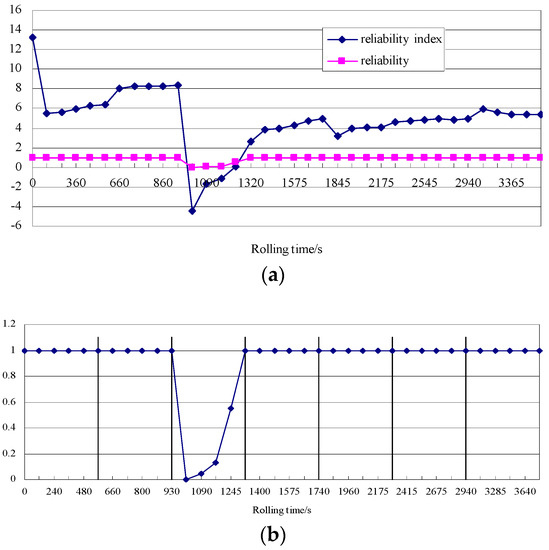 As shown in Figure 9, the sensor reliability and reliability index decreased initially and then increased with increasing rolling time. The reliability and index were lowest in the third rolling pass and close to one for the other rolling passes. The reliability decreased initially and then increased with increasing rolling time in the third rolling pass. At a rolling time of 1005 s, the reliability decreased to the minimum value and was close to zero. At this point, the contact pre-pressure of the sensor was zero; the sensor was non-operational; the shape detection signal disappeared; and the shapemeter malfunctioned. The reliability increased to nearly one at the end of the third rolling pass. At this point, the normal operation of the sensor was restored; the shape detection signal reappeared; and the normal operation of the shapemeter was restored, consistent with the actual operating condition of the shapemeter in the rolling field.