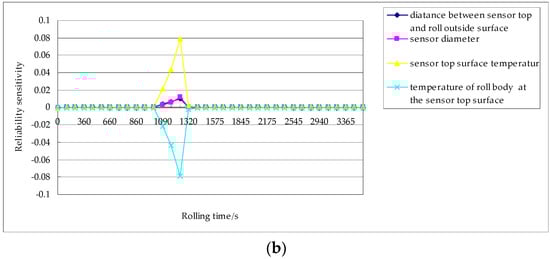 The reliability sensitivity of the mean values is also considered (see Figure 10). As the figure shows, the reliability of the sensor (i) increased with increasing initial interference, sensor diameter, the distance between the sensor top surface and the outer surface of the roll and the temperature of the sensor top surface and (ii) decreased with increasing temperature of the shapemeter roll at the top of the sensor. The impact of the initial interference on the sensor reliability was greatest in the third rolling pass, where a maximum reliability sensitivity of 40 was realized. Compared with the interference, the other variables have less influence on the reliability of the sensor.