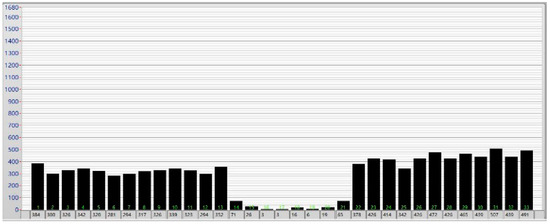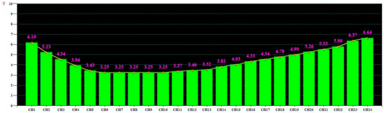 The results of several rolling experiments revealed that the detected signal of the entire rolling process was continuous and complete without any signal discontinuity. The previous analysis revealed that the flatness-detection signal disappeared only in the third rolling pass. Therefore, only a shape detection signal associated with the intermediate rolling time of the third rolling pass (see Figure 15) was obtained.