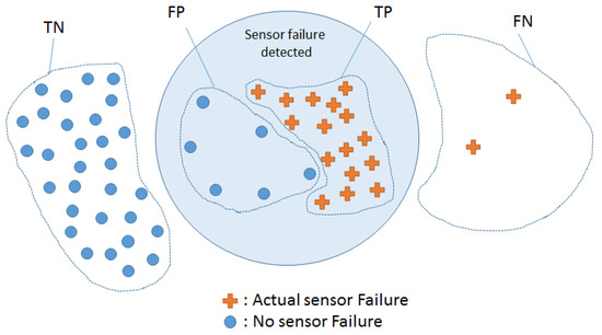 Figure 1 elaborates the terminology with respect to sensor failure detection systems, where the accuracy, precision and recall values are 85%, 72% and 88%, respectively. The accuracy would still be relatively high if the system does not report as many sensor failures as before (lower TP and higher FN), however, the precision and recall would significantly drop. Thus, only using the accuracy for evaluating the system performance is insufficient. The precision indicates the ratio of the correctly reported sensor failures to all the positively reported sensor failures, while the recall indicates the ratio of correctly reported sensor failures to the positive sensor failures ground truth.
