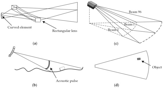 Diagrams of the sonar imaging. (a) A line-focus lens system is composed of a rectangular lens and a curved element; (b) one beam ensonifies a stripe along the bottom; (c) a total of 96 beams are working together; (d) an acoustic image acquired from the adaptive resolution imaging sonar (ARIS).