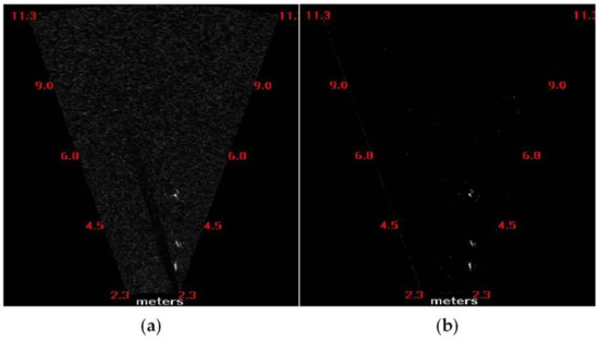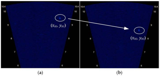 The sonar images corresponding to the data of condition No. 2 in Table 1. (a) Image acquired at time 1; (b) image acquired at time 2.
