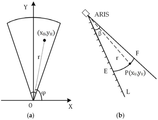 Assume a target appears in the vertical field of view of the sonar, as shown in Figure 3b. Given the range and the azimuth of this beam, the ARIS could not exactly obtain the coordinates , because may appear anywhere in the arc , resulting in a failure to obtain the target’s position in 3D space.