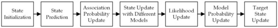 - Association probability update:where represents the posterior probability, given by the measurement connected with the target using the motion model set , and is the joint events set. is a set corresponding to the targets motion models, except . is given by:where is the probability corresponding to the target with model at time .