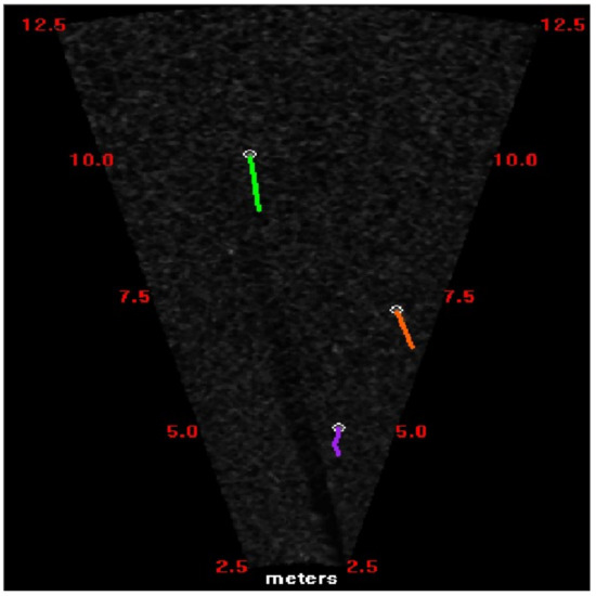 To verify the accuracy of target extraction and tracking in a complicated background, the test data were manually determined. This test data had a total of 144 frames, from which 5971 candidate targets were detected manually, whereas 5901 were extracted using the signal strength model method with a 1.2% error rate, and 5882 were extracted using the adaptive threshold approach with an error rate of 1.5%. Simultaneously, 497 fish were counted manually, and 468 were counted using the tracking algorithm with 5.8% error. Here, a candidate target was a bright region extracted from the sonar image (Figure 2b); hence, the statistics of candidate target numbers is an accumulation of bright regions from all frames. However, a fish target must satisfy the conditions of live targets, including length, width, and swimming speed. One fish represents one track trajectory from presence to absence in several continuous frames.