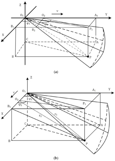 Suppose that the ARIS moves along the y-axis and transmits multi-beams along the y-axis with a certain angle below the plane , as shown in Figure 6a. In this figure, is the location where the ARIS stays at time , is the location where the ARIS stays at time , point is the object needing to be positioned. To facilitate the understanding and calculation of the coordinates, the cuboid is established, in which is the body diagonal, is the projection of on the plane , is the projection of on plane , and is the projection of on plane . In this cuboid, we set , , , and , in which and were the target coordinates extracted from site and , respectively.