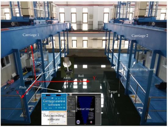 An experiment was performed to evaluate the accuracy of the proposed approach for obtaining the target’s 3D position using an imaging sonar. The experiment was conducted in a pool with a length of 50 m, width of 15 m, and depth of 10 m. The water depth in this experiment was approximately 9 m. Two carriages were present above the pool, and each carriage had a platform with two vertical lifting hooks. The ARIS was fixed on one of the vertical lifting hooks on carriage 1, accessed by a laptop, and was submerged under water just until completely covered, with a pitch angle of 10° downward (Figure 7). Carriage 1 moved in the same direction as the sonar beam transmitting direction, controlled by carriage control software running in the laptop, and the state information of this carriage, including the location and time, was also recorded by another program running in this laptop. The target was hung under water on carriage 2. The target was a metal cylinder with a bottom diameter of 54 mm and a height of 107 mm.
