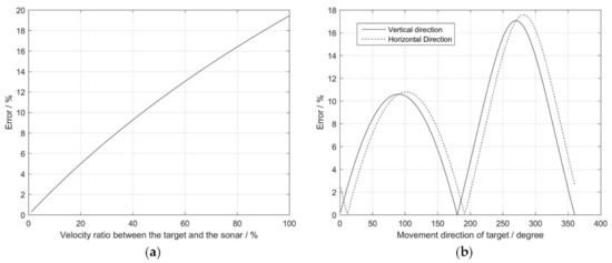 The influence of different factors on the positioning error: (a) Velocity ratio between the target and the sonar; and (b) target’s moving direction, including vertical direction and horizontal direction.