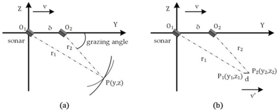 Diagram of the target and sonar in different states. (a) The target is stable while the sonar moves; (b) the target and the sonar move simultaneously.
