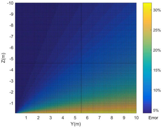 Assuming that the sonar is displayed as in case 2 shown in Figure 10, the target moves in the plane YOZ and is located at point at time , and at point at time . Given the spherical coordinates between and as and , the measurement error of the distance is 5%, and the positional error is defined by Equation (35). When the target position corresponds to the sonar changes in the plane YOZ, the positional error is obtained as shown in Figure 11. From this figure, the error increases with the increase in the Y value or the Z value but stays almost the same regardless of the Z value when the Y value is less than 1. In other words, the error decreases as the grazing angle increases.