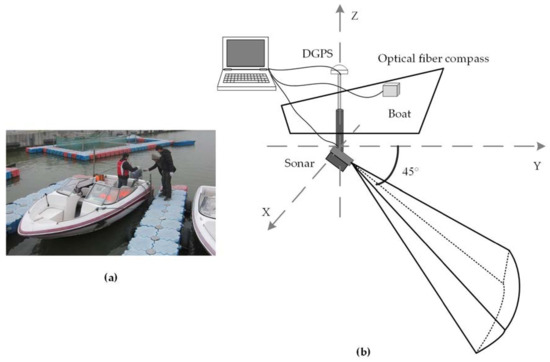 In this experiment, the sonar was mounted 0.5 m underwater on the side of a boat, with a pitch angle of 45° downward. The detection direction was along the y-axis, in the same direction as the boat movement (Figure 12). The velocity of the boat was 2 knots. The GPS module (DGPS) and the attitude sensor (optical fiber compass) were accessed by a laptop. The optical fiber compass included an attitude sensor to obtain the attitude of the sonar in real time and to improve the sonar image. If the attitude of the sonar exceeded the reasonable scope, the sonar data were abandoned.