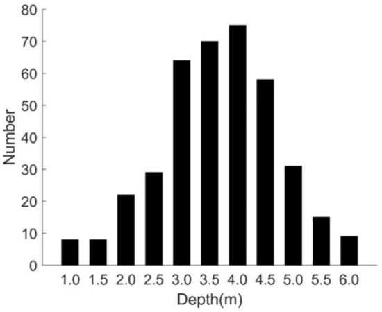 We recorded a dataset covering a period of 10 min and ran statistics on fish vertical distribution according to depth, as shown in Figure 13. A total of 391 fish were counted in this dataset, and most of the fish swam at depths of three to five meters.