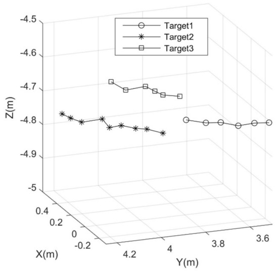 Ten consecutive frame images were selected to calculate the targets’ 3D coordinates, as shown in Figure 14. With the method proposed in this study, the target trajectories were obtained, as shown in Figure 15. This figure shows three tracks in 3D space, and different types of lines represent different tracks.
