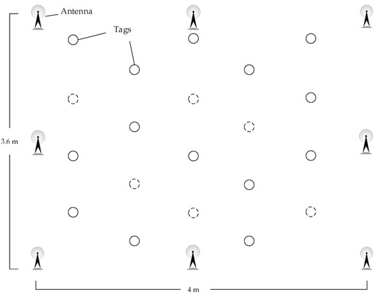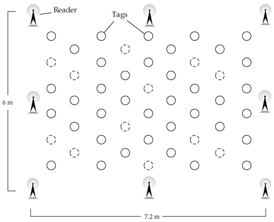 As shown in Figure 2, we have performed a simulation experiment on the MATLAB platform and simulated a 6 m × 7.2 m area, the reference readers are placed in the corners and the edges, and the RFID tags are distributed in the region. The objective of our simulation experiment is to analyze the impact factors and compare the localization effect in different environments. The experimental configurations are as follows: (1) operating systems: Windows 10 x64 v1803; (2) CPU: Intel(R) Core(TM) i3-4160 @ 3.60 GHz; (3) memory: 4 GB; and (4) software: MATLAB R2015b.