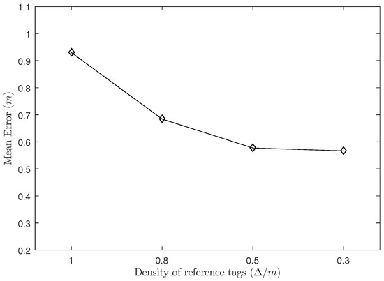 In this experiment, we set the number of readers to and the proportion of labeled samples to 40%. We divide the reference tag density into 1.0 m, 0.8 m, 0.5 m and 0.3 m.