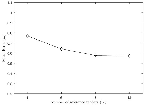 As shown in Figure 4, the positioning error of the system decreases as the number of reference readers increases. When the number of reader increases from 4 to 6 and from 6 to 8, the localization accuracy improves noticeably, but when the number of reference readers increases to a certain degree and provides duplicate data, it does not change much on the positioning error, and the increasing in the number of readers will obviously increase the cost of the entire positioning system.