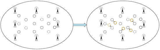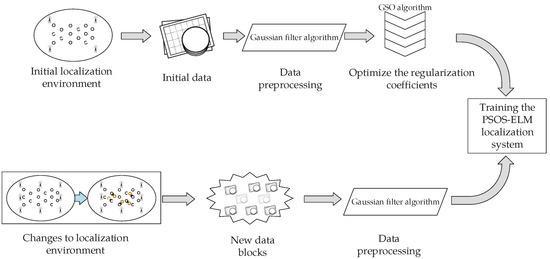 At the same time, as shown in Figure 6, to verify the adaptability of the GSOS-ELM positioning algorithm in the environment, we move some labeled reference tags during the experiment to observe the average error of the positioning system. The specific steps to process the dynamic changes are shown in Figure 7, when the localization environment changes and the new data blocks arrive, we use improved Gaussian filter algorithm mentioned in Procedure 3 to preprocess the data and update the initial PSOS-ELM.