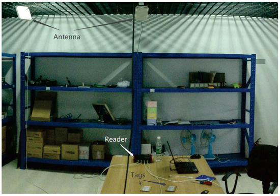 The reader model we used is Alien ALR-9900+ [41], the main working frequency is 920 MHz, the maximum power strength is 30.7 dBm. We use two kinds of antennas, their model are Alien ALR-8696-C [42] (8.5 dBic gain) and ALR-9611-CR [43] (6 dBic gain). Our experiment setting is shown in Figure 8 and Figure 9, we finish the experiments under a realistic environment with 4.00 m long and 3.63 m wide, we place 8 antennas in the corners and edges and 20 passive RFID tags inside the area. The computer communicates with the ALR-9900+ reader via TCP/IP protocol. Same as previous, the parameters setting is in Table 3, the proportion of labeled samples is 40%, and the 10-fold cross-validation is adopted to evaluate the performances.