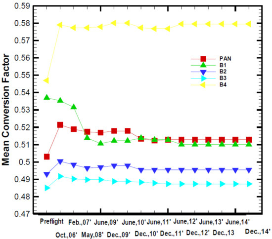 Figure 1, FORMOSAT-2 (FS-2) onboard sensors’ degradation causes the temporal variation of mean conversion factor between the output digital number (DN) and the input radiation intensity of the observed imagery. Hence, sensors must be regularly calibrated and corrected with the radiometric conversion factor to ensure high-quality imagery. Similar to the FS-2 satellite, this requirement is also true for the optical remote-sensing instrument (RSI) onboard FS-5. Sensors’ calibration is generally a crucial task both before and after a satellite’s launch. Specifically, the relative and absolute radiometric calibration of on-orbit sensors play a key role in the aspect of optical imaging applications. For imagery, data quality is vital for scientific applications such as satellite data assimilations in numerical weather prediction (NWP) and so on. The accuracy of radiometric calibration needs to be well evaluated and achieved at a certain level of radiometric stability. As a rule of thumb, applications or research studies demand remote-sensing data from sensors with long-term radiometric stability, where the radiometric uncertainty in the data is less than the minimum detectable change in magnitude of the target signal [