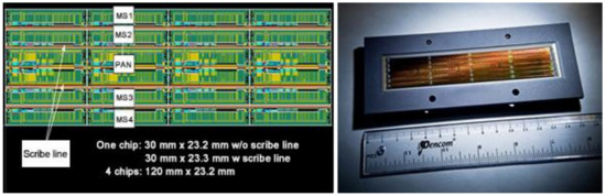5]. The FS-5 satellite—launched on 25 August 2017—operates in a sun synchronous orbit at an altitude of 720 km with a 98.28-degree inclination angle. The primary payload of FS-5, the RSI optical imager, is equipped with a 2-m resolution panchromatic (PAN) band and 4-m resolution multispectral (MS) bands (PAN band with 12,000 pixels and MS bands with 6000 pixels each). Instead of a traditional CCD (charge-coupled device), a CMOS (complementary metal oxide semiconductor) is employed for the RSI as shown in