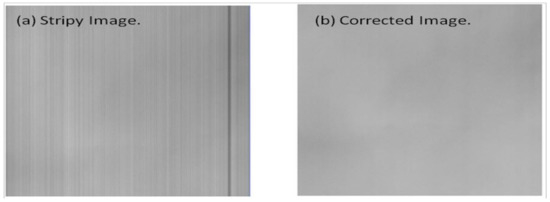Figure 3a) and banding are not desired as they contaminate the radiometric information acquired. Hence, the preprocessing of imagery, such as the steps of removing image striping and banding, is necessary prior to any further applications (e.g.,