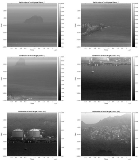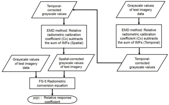 The approaches mentioned above are generally focused on the calibration of sensor detectors, addressing the density (pixel values) calibration in spatial variation of the image. However, an imperfect sensor’s performance may vary both temporally and spatially. The non-uniformity of a detector response exists not only in the spatial variation but also in the temporal variation, which appears in FS-5 imagery. Thus, a decent calibration method able to retrieve accurate at-sensor grayscale values is necessary [