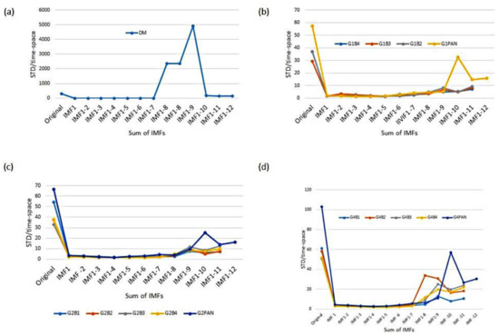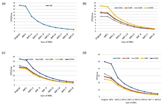 Testing results show that the EMD–HHT method of relative radiometric calibration proposed in this study is able to eliminate the striping and banding of the test imagery dataset caused by the non-uniformity of sensors. The overall improvement rate is over 95% for all spectral bands and gain settings. The temporal relative radiometric calibration subsequently reduces the accumulative numbers of IMFs required for filtering as well as the post-calibration mean STD, indicating the significance of and need for relative radiometric calibration in the temporal variation.