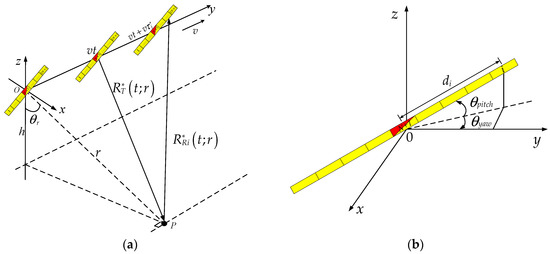 Because of the low speed of sound in water, the moving distance of SAS between transmitting and receiving signal is not negligible and should be taken into account. This mode is referred to as ‘non-stop-hop-stop’ [25,26]. Supposing the delay between transmitting and receiving signal is , the moving distance of SAS is and the ith receiving hydrophone is located at the position when it collects the scattered signal of the point P. Thus, the 1-way propagation path of P to the ith receiving hydrophone is