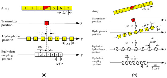 To make use of the existing monostatic synthetic aperture imaging algorithm [22], such as RDA, CSA and RMA, etc., it is necessary to transform the multiple hydrophone signals into a single hydrophone signal by the preprocessing step [27]. As a comparison, Figure 2a shows how the multiple hydrophone signals are transformed in the case without inclination. In Figure 2a, the equivalent sampling position of a single hydrophone is the midpoint between the position of the transmitted signal and the position of the collected signal.