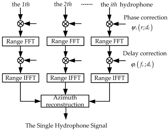 The third step is the delay correction. Because is weakly dependent on the range [24], it can be replaced by the delay at the reference range rref. Then, the correction for the constant delay is performed on the echo signal of each hydrophone in the range frequency domain by a phase multiplication. Combining Equations (19) and (20), the factor for this phase multiplication is