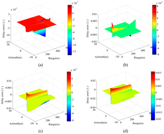 Delay errors. (a) 2° yaw angle and 0° pitch angle; (b) 0° yaw angle and 2° pitch angle; (c) 2° yaw angle and 2° pitch angle; (d) 3° yaw angle and 3° pitch angle.