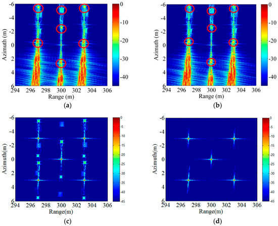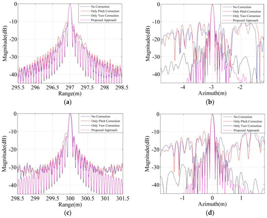 It can be seen that the pitch angle correction reduces the energy of some false targets by comparing the red circle part in Figure 6a,b. Moreover, by comparing Figure 6a and Figure 6c, it is found that the targets have been well focused but there are still some false targets with strong energy when only yaw angle correction. These compared results show that the yaw angle correction has a significant impact on the imaging quality, and the pitch angle correction can further improve the imaging quality. In addition, it is found in Figure 6d that all targets are well focused and there is no false target after the array is corrected by the proposed approach in this paper. In order to compare the imaging results in more detail, the azimuth and range slice of the point P1 and P5 are shown in Figure 6. Then their impulse response width (IRW), peak sidelobe ratio (PSLR) and sidelobe ratio (ISLR) are measured, and the results are shown in Table 2.