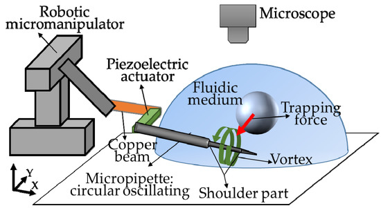 This method is inspired by the phenomenon found in the experiments of active release by oscillating the piezoelectric actuator, which is the released object can be trapped again by continuously vibrating the piezoelectric actuator [10]. As shown in Figure 1, we modify a common micromanipulator system through setting a piezoelectric actuator between a copper beam and the micropipette. The copper beam, piezoelectric actuator and micropipette are positioned together by a robotic micromanipulator. By oscillating the piezoelectric actuator at a certain frequency, the micropipette mounted on it can oscillate circularly, which is able to induce a vortex around the micropipette in microscale. The vortex featuring low pressure in the core region can be applied to trap the micro objects nearby and transport them together with the micropipette. In this section, we will analyze this method from two aspects: the generation of micropipette’s circular oscillation and induced vortex.