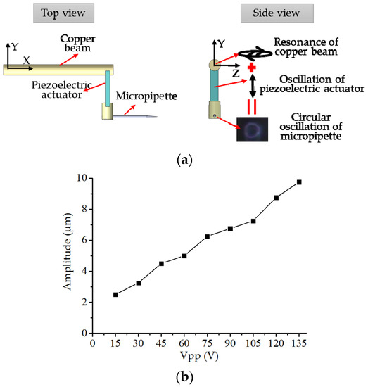 By adjusting Vpp of the sinusoidal voltage input into the piezoelectric actuator, amplitude of the piezoelectric actuator’s oscillation and the resonance amplitude of the copper beam can be changed equidistantly. It provides a way to control the amplitude of the circular oscillation the Figure 2b clearly shows the relationship between Vpp of the sinusoidal voltage input into the piezoelectric actuator and the amplitude of the circular oscillation of the micropipette.