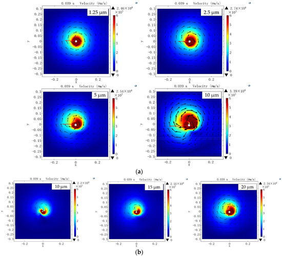 Simulation results of the vortex induced by circular oscillation of the micropipette: (a) flow velocity distribution with different circular oscillation amplitudes and (b) flow distribution with different outer diameters of the micropipette.
