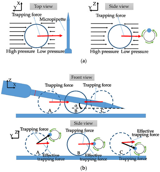 The trapping mechanism of the proposed method is mainly based on one feature of the micropipette that is the decreasing pressure from the distance to the core region of the vortex. As shown in the Figure 4a, the difference of the pressures exerting on the side near the vortex center and the side far can generate a trapping force to force the object in the flow field to move close to the micro pipette and stay close during the transportation along the Y axis. The bottom under the micro object or the gravity will stop the trapped object to rotate around the micropipette.