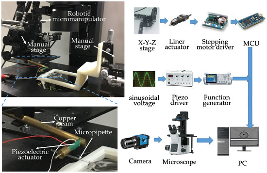 To demonstrate the performance of the proposed method and characterize the key parameters, we have set up a robotic micromanipulation system mainly including the robotic micromanipulator controlling, piezoelectric power supplying and microscope imaging. The robotic micromanipulator was assembled by a 3 DOF stage (TAM-655, Sigmakoki, Japan) and three stepping motors (SGSP-13ACT-B0, Sigmakoki, Japan) powered by drivers (SG-55MA, Sigmakoki, Japan). In piezoelectric power supplying system, the sinusoidal voltage was first generated by the function generator (AFG-2225, GW Instek, China), and then was amplified by the piezo driver (PZJ-0.15P, Matsusada Precision Inc., Japan). The inverted microscope (IX 73, Olympus, Japan) connecting with a digital camera (640 × 480, Imagingsource, Germany) provides the image feedback. With the setup shown in Figure 5, the frequency that could generate the circular oscillation of the micropipette is 350 Hz.