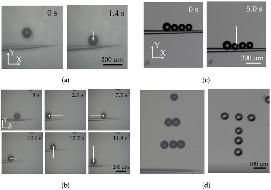 The micropipette with a shoulder part (outer diameter of 20 μm) was used and put into the water with 50 μm distance between the middle of the shoulder part and the bottom. α was set to 10°. Vpp of the input sinusoidal voltage was 135 V. As shown in Figure 6a, the microbead which stays in 200 μm trapping range was successfully trapped within 1.4 s. The trapping process has an obvious acceleration. Then, the trapped microbead was transported together with the micropipette (Figure 6b) to the left of visual field, then from the left to the center, upward, and downward finally. The whole process took 14.8 s. Besides, four microbeads were transported together up and down to demonstrate the method’s ability of parallel operation of multiple objects. Finally, with the proposed method, a triangle array assembled by 10 microbeads and a “T” array including 6 microbeads were achieved.