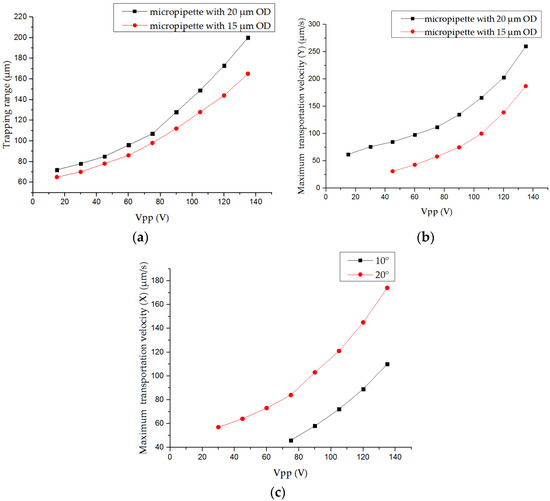 Experimental results of key parameter characterization with microbeads: (a) influence of the outer diameter of the micropipette’s shoulder part and Vpp of the input sinusoidal voltage on the trapping range; (b) influence of the outer diameter of the micropipette’s shoulder part and Vpp of the input sinusoidal voltage on the maximum transportation velocity along the Y axis; and (c) influence of the angle between the micropipette and the bottom (α) and Vpp of the input sinusoidal voltage on the maximum transportation velocity along the X axis.