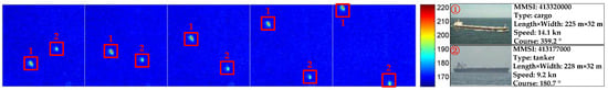 Figure 5 is the amplitude information of tracked ships. In Figure 5a, the amplitudes of the same target in five frames are represented by the same color. It can be seen from that the ship’s amplitude is stable and distinguished. This is also the reason we use amplitude information for improving tracking performance. Figure 5b is the mean amplitudes of tracked ships compared with ship sizes in AIS data. We can see that the larger the size of the ship, the greater the amplitude value, and easier to be detected. The range of lengths of ships is from 40 m to 400 m, and even some ships whose lengths are below 50 m (less than the image spatial resolution of the GF-4 satellite) can be identified after ship detection and tracking. From another perspective, it also reflects the strong capabilities of the GF-4 satellite for marine surveillance.